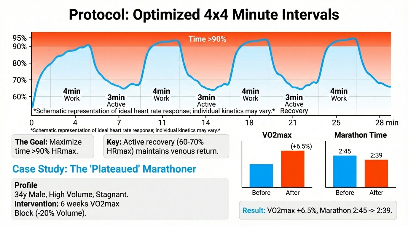 Intervention: A 6-week 'VO2max Block.' Volume reduced by 20%. Two sessions per week of 4x4min intervals replaced tempo runs. Low-intensity runs were slowed to ensure autonomic recovery.