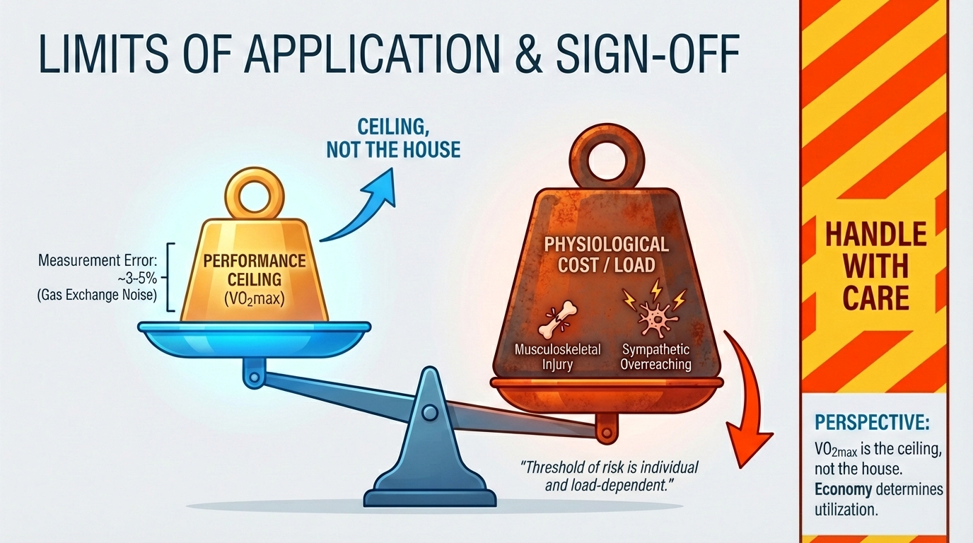 While T@VO2max is a potent stimulus, it is structurally and metabolically costly. It carries a higher risk of musculoskeletal injury and sympathetic overreaching than submaximal training. Furthermore, VO2max values derived from gas exchange analysis have a measurement error of approx. 3-5%.