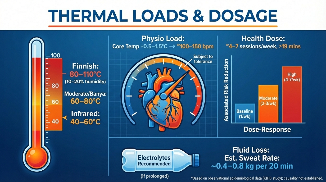 • Physiological adaptation is driven by core temperature elevation, typically increasing by 1–2 °C during a session.