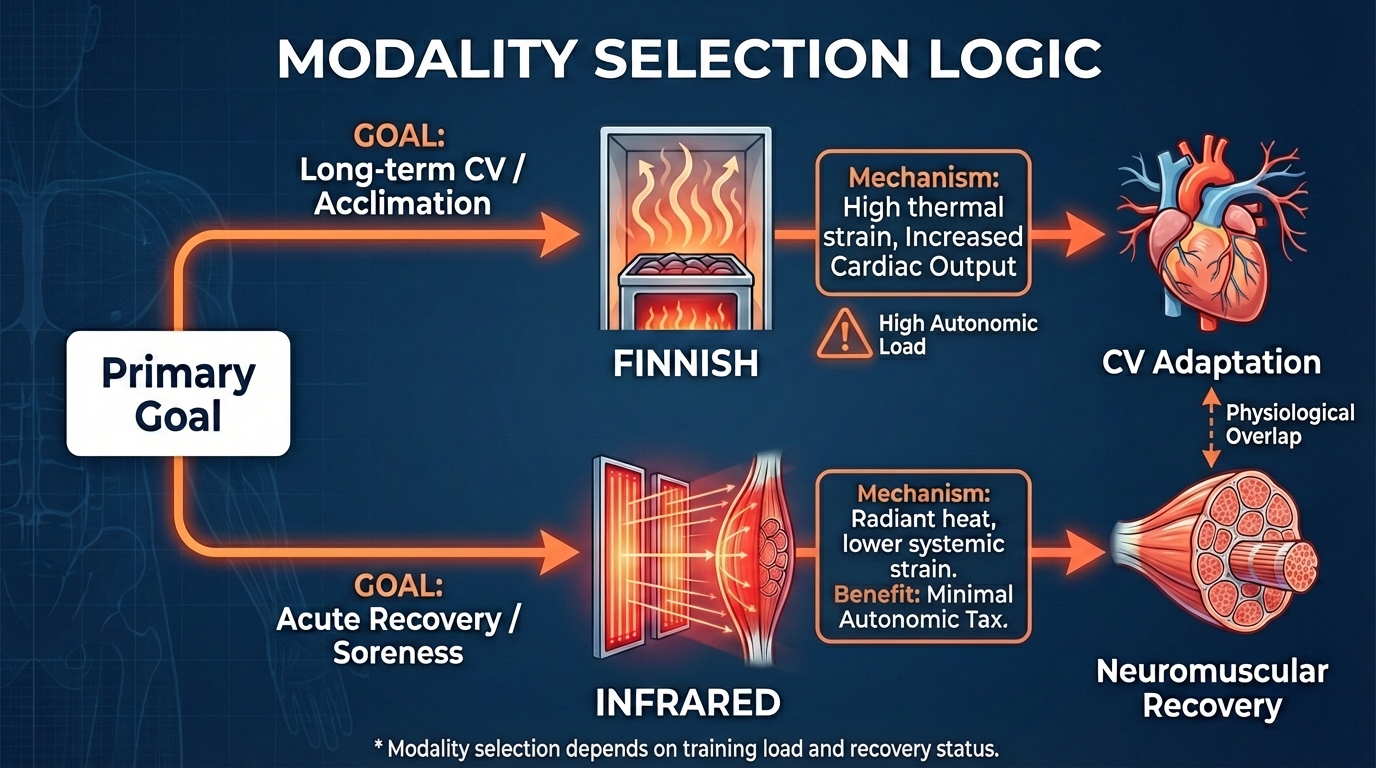 Practitioners must select the sauna modality based on the primary physiological objective and the proximity to peak performance demands. If the goal is long-term cardiovascular adaptation, endothelial function improvement, or heat acclimation, traditional Finnish sauna is the superior choice due to its higher thermal load and robust evidence base regarding mortality reduction and plasma volume expansion.