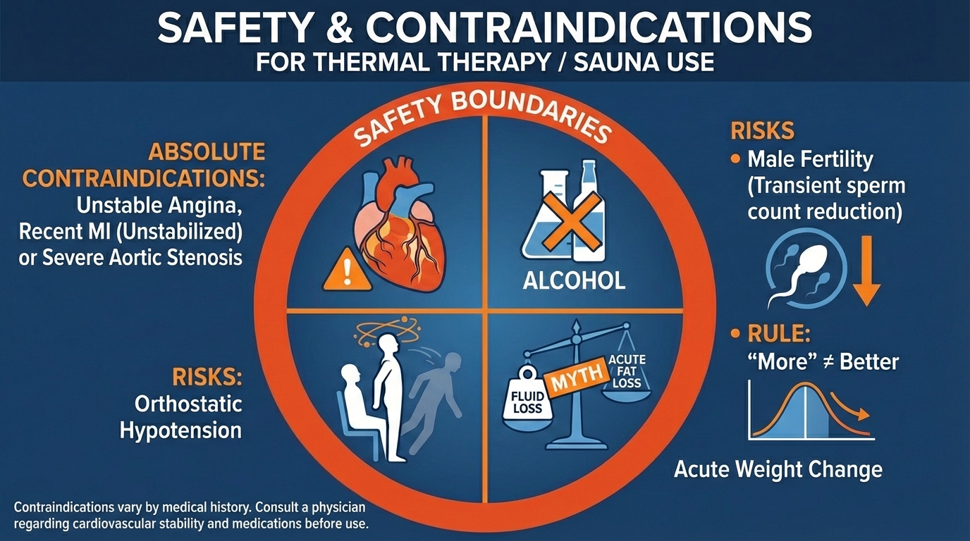 While generally safe, sauna use has distinct boundaries. Absolute contraindications include unstable angina, recent myocardial infarction (within 2 weeks), and severe aortic stenosis.