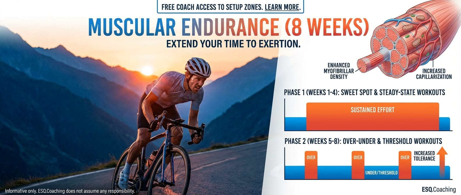 Ready to extend your time to exertion and elevate your cycling performance? Our 8-Week Advanced Muscular Endurance Training Plan is your ultimate solution! Includes FREE Coach access to setup zones.