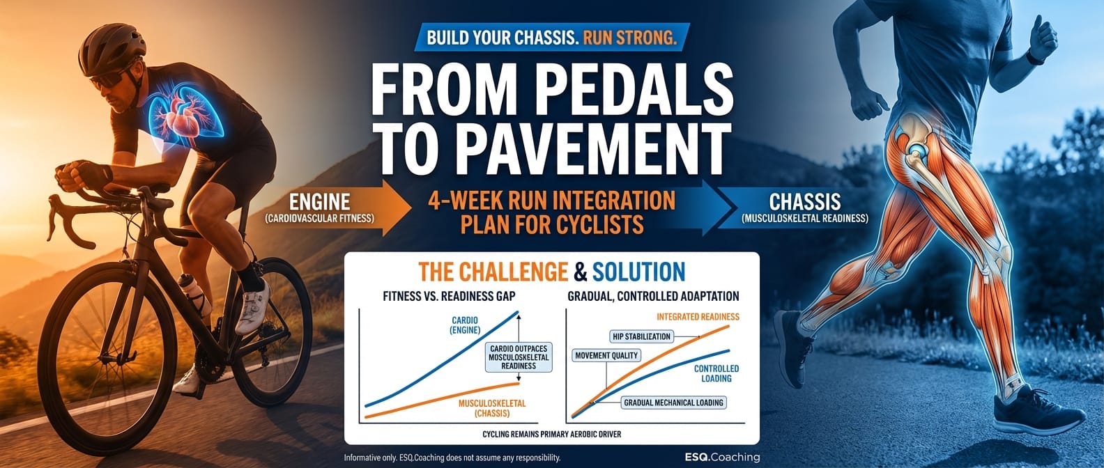 As a cyclist, you cannot simply “run your fitness into shape.” Your connective tissue, hip stabilizers, and neuromuscular coordination must be prepared deliberately.